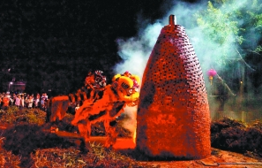 伴隨著鑼鼓聲和醒獅起舞,燒番塔正式開始。幾名年輕力壯的村民將干草放入塔洞內;馃饋砗,濃煙漸漸從塔身空隙冒出。火苗逐漸旺盛的時候,燒塔的壯年不斷翻動塔內燃燒的干草,燦爛奪目的火星向四周迸射而出,火苗越升越高,沖出塔頂,場面十分震撼。