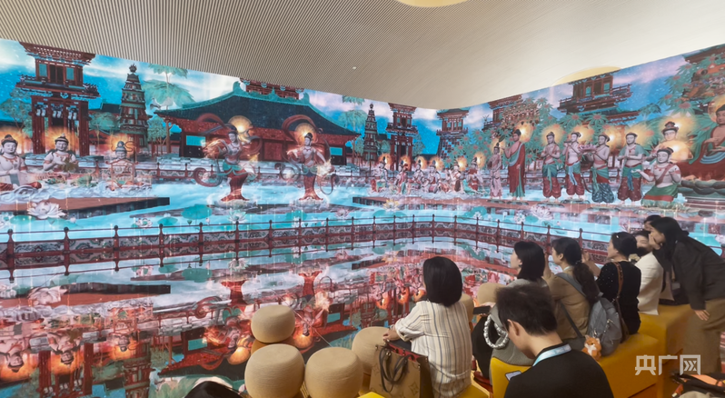 “舞樂敦煌”數字沉浸展呈現莫高窟特窟初唐321窟北壁的西方凈土經變畫,用光影數字藝術來重新活化古代的壁畫,展現穿越千年、恢宏大氣的敦煌天樂境界之美;“尋境敦煌”數字敦煌沉浸展借助穿戴VR設備讓觀眾身臨其境地體驗洞窟參觀的真實感受。