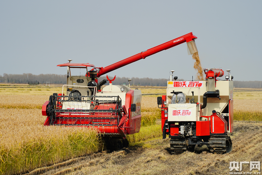 無(wú)人駕駛收割機(jī)和無(wú)人駕駛運(yùn)糧機(jī)展示協(xié)同作業(yè)運(yùn)糧。(央廣網(wǎng)發(fā))