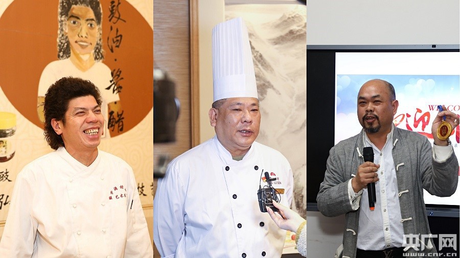 從左到右依次為:旺閣漁村創始人吳榮開、白天鵝包餅房大廚馮立新、中山紅木雕刻大師陳正民。(央廣網發)