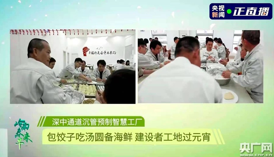 直播當日適逢元宵佳節,深中通道的許多建設者都選擇了就地過年。在工地上,建設者們一起包餃子、吃湯圓……各樣的娛樂休閑活動,讓年味依舊灑滿了食堂。