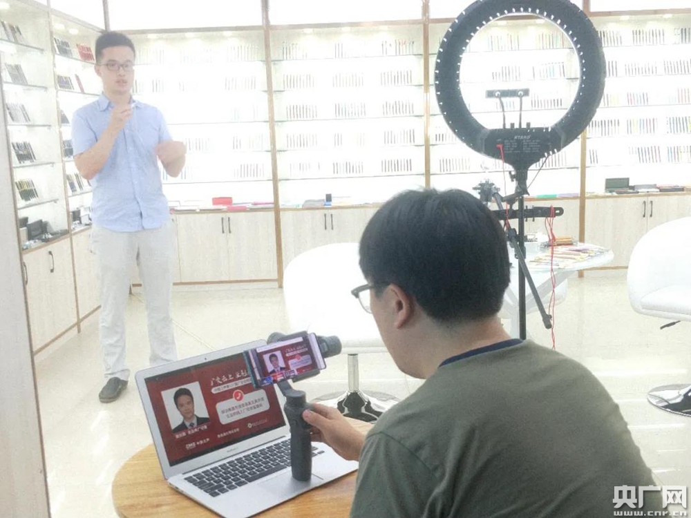 總臺(tái)央廣記者謝元森在凱龍文具禮品有限公司的廣交會(huì)直播間直播采訪