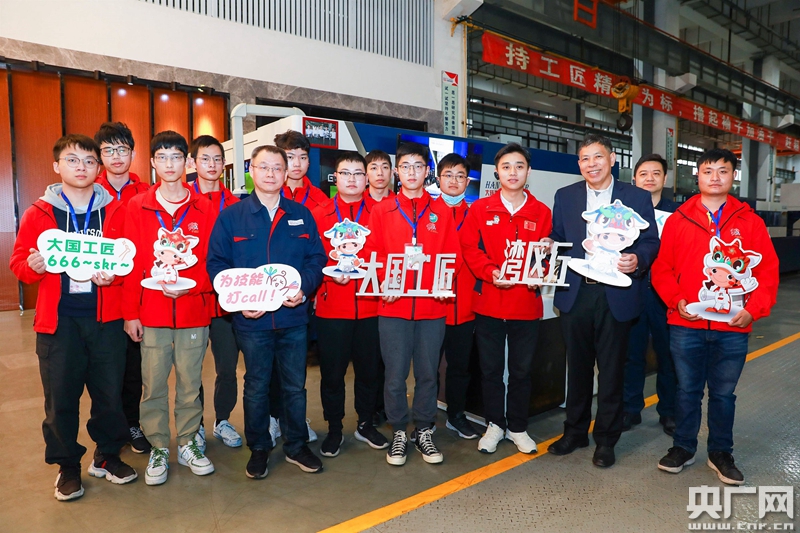 選手們手持激光打印出來的“大國工匠灣區(qū)行”,在生產(chǎn)線合影留念。(央廣網(wǎng)發(fā))