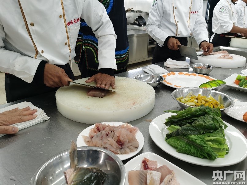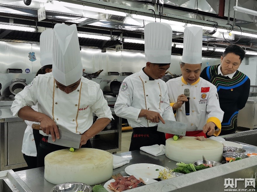 國賽選手楊東升與彝族學員同臺PK片魚刀工。(央廣網發)