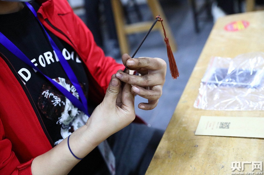 國賽選手們親自體驗制作紅木書簽。(央廣網發)