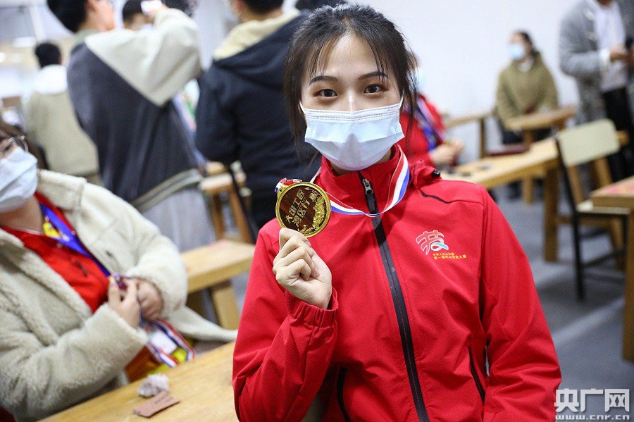 紅木大師親手雕刻“大國工匠灣區行”紅木紀念章贈予國賽選手。(央廣網發)