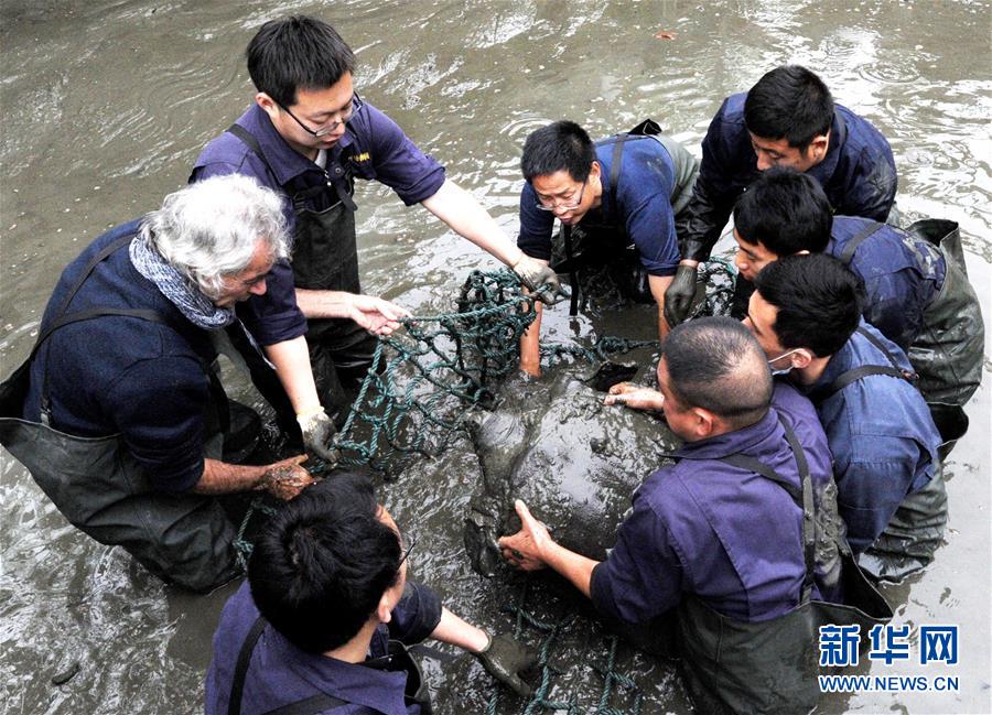 4月7日,中外動物專家和飼養員將蘇州動物園池塘內的雌性斑鱉抬上岸。