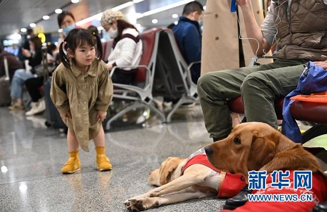 小乘客“圍觀”導盲犬乘機。劉恒攝