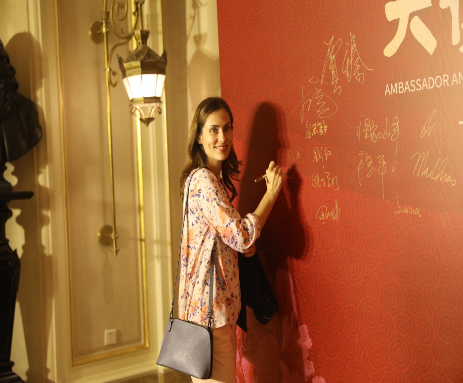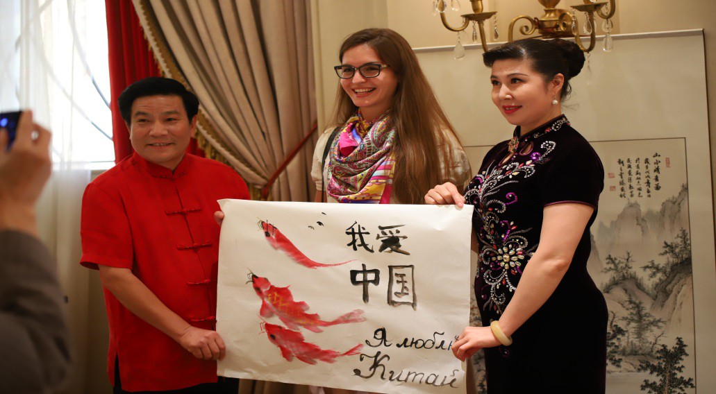 著名書畫大師歐陽中石的關門弟子王忠友也現場揮毫潑墨,畫出了象征幸福的紅色鯉魚,中外使節及夫人紛紛拿起毛筆,在畫作上寫下“我愛中國”等漢字,一起完成了一副代表中外友誼