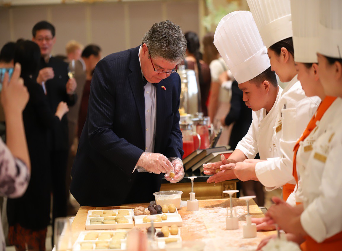 隨后,中外使節及夫人們在中國面點大師的指導下饒有興致地親自動手制作了月餅。