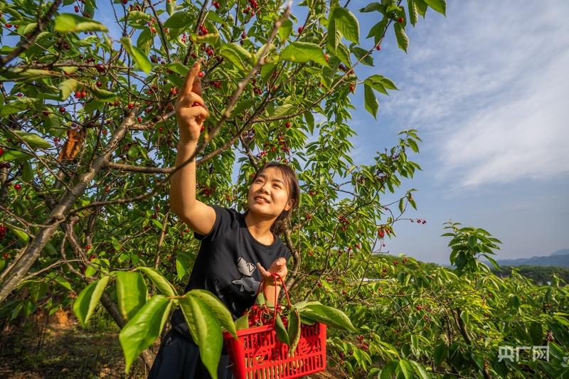 游客在采摘成熟的瑪瑙紅櫻桃(央廣網發 羅大富 攝)