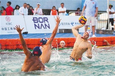 4月27日,中國隊在三亞亞沙會男子水球單循環(huán)賽第三輪爭奪中,以3∶0戰(zhàn)勝中國香港隊,取得三連勝。圖為中國隊持球進攻。4月28日,中國隊與亞洲勁旅哈薩克斯坦隊正面交鋒。(記者 王程龍 攝)