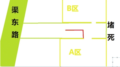 A區進出的車輛都需繞過紅色的L形墻才能通過,而A區B區中間的路并未修通。