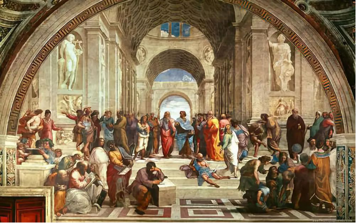 意大利畫家拉斐爾·桑西于1510~1511年創作的一幅壁畫作品《雅典學院》,現收藏于意大利梵蒂岡博物館。該畫以古希臘哲學家柏拉圖舉辦雅典學院之逸事為題材,以極為兼容并蓄、自由開放的思想,打破時空界限,把代表著哲學、數學、音樂、天文等不同學科領域的文化名人會聚一堂,以回憶歷史上黃金時代的形式,寄托了作者對美好未來的向往,表達了對人類追求智慧和真理者的集中贊揚。