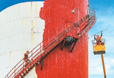 4月22日,中國石化安慶分公司工人為生產設備刷新漆。程周平攝(人民視覺)