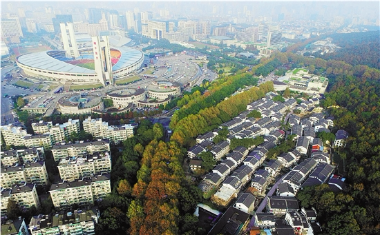 經過一年半的整治改造,緊鄰黃龍商圈的白沙泉華麗轉身。圖為白沙泉航拍照。