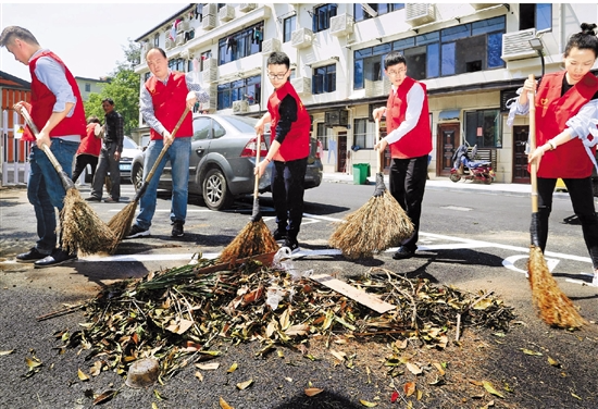 4月28日,杭州駱家莊社區的黨員干部和志愿者在清理改造后的建筑垃圾。