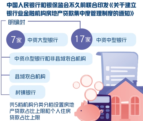 中國人民銀行和銀保監(jiān)會不久前聯(lián)合印發(fā)《關(guān)于建立銀行業(yè)金融機構(gòu)房地產(chǎn)貸款集中度管理制度的通知》,明確對7家中資大型銀行、17家中資中型銀行、中資小型銀行和非縣域農(nóng)合機構(gòu)、縣域農(nóng)合機構(gòu)、村鎮(zhèn)銀行,共5檔機構(gòu)分類分檔設(shè)置房地產(chǎn)貸款占比上限和個人住房貸款占比上限。其中,中資大型銀行的房地產(chǎn)貸款占比上限被設(shè)定為40%,個人住房貸款占比上限為32.5%。其余機構(gòu)的相關(guān)貸款占比則依檔次不同依次減少。