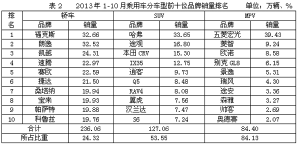 1-10月,乘用車共銷售1445.51萬輛,同比增長14.99%。其中:基本型乘用車(轎車)銷售970.51萬輛,同比增長11.37%;運動型多用途乘用車(SUV)銷售237.27萬輛,同比增長47.92%;多功能乘用車(MPV)銷售100.32萬輛,同比增長1.5倍;交叉型乘用車銷售137.41萬輛,同比下降25.45%。