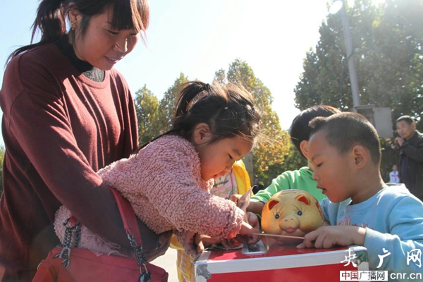 當日上午,募捐活動在中牟縣新世紀廣場舉行,政府機關公務員、企業家、農民、環衛工人、教師、小學生……眾多社會愛心人士紛紛來到募捐活動現場奉獻慈善愛心。活動現場年齡最小的是來自官渡路小學三年級9歲小學生曹原,曹原把自己的儲錢罐的壓歲錢一股腦兒倒進了募捐箱里:“我也要獻一份愛心,我也要幫助別人。”