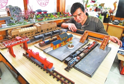站臺、站房、天橋、鐵軌、蒸汽機車、電力機車、貨運列車、龍門吊……11月24日,走進洛陽車站貨運員孫玉明的家中,一件件逼真的鐵路模型擺在桌子和窗臺上,讓人仿佛進入了“鐵路王國”。為了給新學員做業務培訓,他用廢紙箱板、泡沫板、掉落的樹枝等材料,按比例做成模型給學員講解。8年以來,他已制作出百余件鐵路模型。