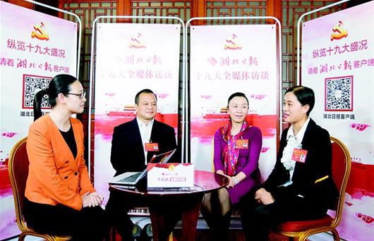 湖北日報訊 圖為:鄭雄代表(左二)、王波代表(右二)、仰媛媛代表(右一)參加湖北日報十九大全媒體訪談。(記者 柯皓 攝)
