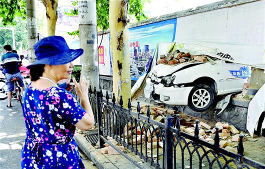 駕校位于江岸區匯通路和京漢大道交會處,撞破的院墻緊挨京漢大道的人行道。楚天都市報記者在現場看到,破洞面積約2平方米,車身印有“藍盾駕!弊謽拥慕叹氒嚻茡p車頭從洞口伸出,車輪懸空(如圖)。駕校方已在破洞兩側用鋼管等將人行道攔住,避免行人在墻下發生危險。駕校人員在懸空的車輪下墊起磚頭,然后準備用車將教練車從洞里拖出,但因車底盤被卡嘗試兩次都沒成功。“我當時踩了剎……”李先生說,他當時正在進行科目二練習,不知怎的撞上了另外一臺車,然后他踩剎車車就沖向了院墻。