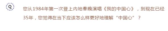 張明敏:中國的經濟近幾十年高速發展,我們需要沉淀,并從沉淀里去感受這種“中國心”的存在,為什么?因為“中國心”這三個字有著強烈的愛國主義,必須要從小培養,現在部分香港年輕人丟掉了這顆“中國心”。我經常說“我的中國心”,其實是“大家的中國心”,我們要珍惜香港,要把“一國兩制”落實好,就需要“大家的中國心”。