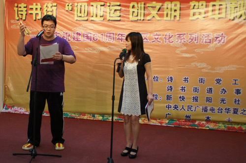 (記者 陳健光 通訊員 鄧毅富 圖 陳健光)由中央人民廣播電臺華夏之聲、廣州市社科院嶺南文化研究中心、廣州市越秀區文學藝術界聯合會、新快報陽光社區、詩書街道辦事處、廣州本土網等聯合舉辦的“玩轉廣州古街巷”活動,于中秋前夜(9月21日)晚上進軍廣州的詩書街道,用豐富的文化節目與當地居民群眾一起迎國慶、賀中秋!