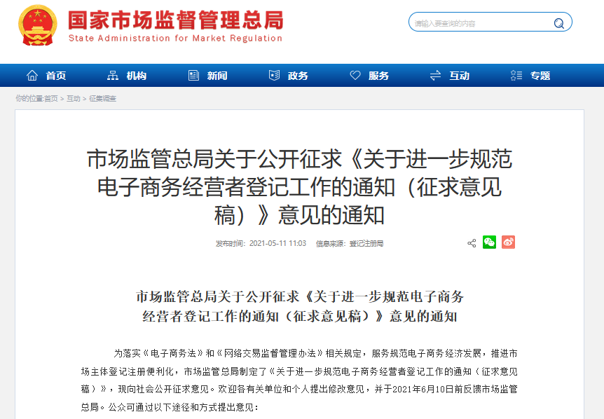 央廣網北京5月11日消息(記者 牛谷月)記者從市場監管總局官網獲悉,為服務規范電子商務經濟發展,推進市場主體登記注冊便利化,市場監管總局制定了《關于進一步規范電子商務經營者登記工作的通知(征求意見稿)》(以下簡稱“意見稿”),即日起向社會公開征求意見。