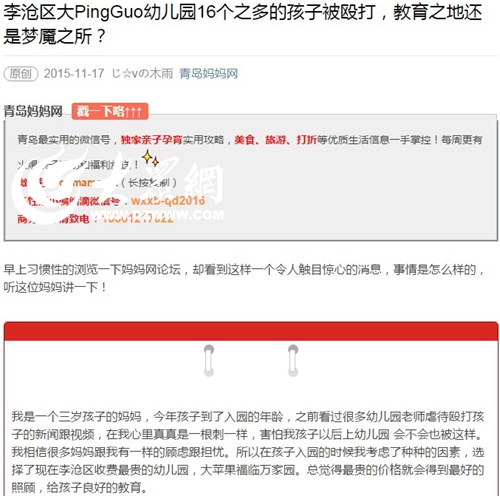 大眾網青島11月18日訊11月17日,網上一篇“李滄區大蘋果幼兒園16個之多的孩子被毆打 幼兒園鉆監控死角漏洞”的帖子被網友大量轉發。17日晚,李滄教體局發布聲明說,經警方問詢,尚無證據證明教師有體罰學生行為;另外事發當日的錄像因故障無法調取。大眾網記者18日采訪到發帖人韓女士,她對李滄區教體局的聲明不滿意,并要求幼兒園向學生道歉。