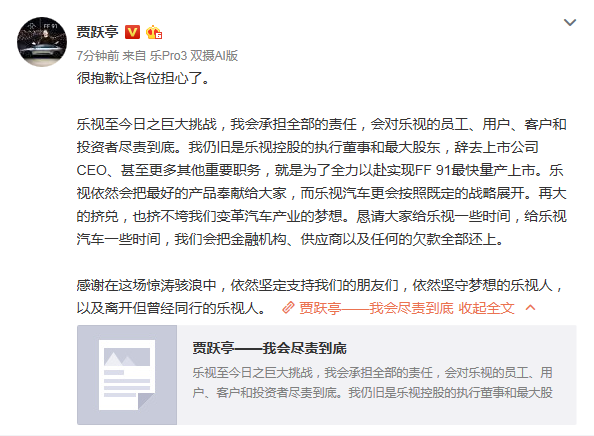 賈躍亭在微博上表示:樂視至今日之巨大挑戰,我會承擔全部的責任,會對樂視的員工、用戶、客戶和投資者盡責到底。我仍舊是樂視控股的執行董事和最大股東,辭去上市公司CEO、甚至更多其他重要職務,就是為了全力以赴實現FF 91最快量產上市。樂視依然會把最好的產品奉獻給大家,而樂視汽車更會按照既定的戰略展開。再大的擠兌,也擠不垮我們變革汽車產業的夢想。懇請大家給樂視一些時間,給樂視汽車一些時間,我們會把金融機構、供應商以及任何的欠款全部還上。