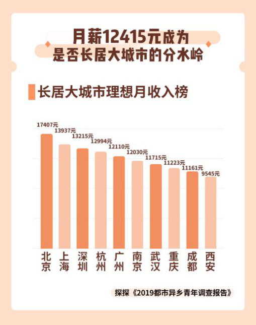 在調(diào)查問卷發(fā)放的10座城市中,不同城市的異鄉(xiāng)青年對能在各自城市長久生活的理想月收入有不同意愿。在北京的異鄉(xiāng)青年認為的理想月收入最高,為17407元,上海13937元、深圳13215元、杭州12994元和廣州12110元位列前五。