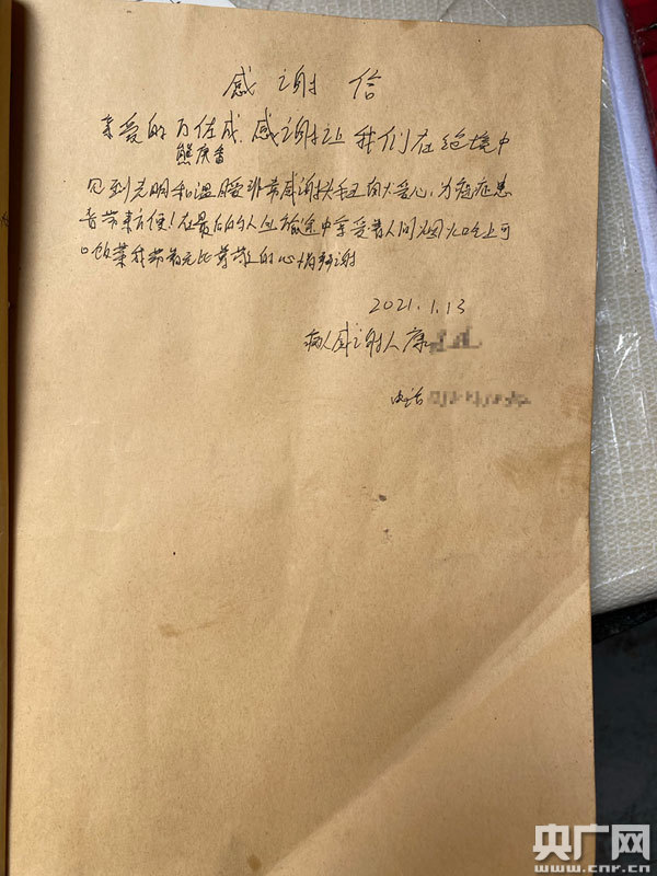 病人家屬手寫的感謝信(央廣網記者 謝元森 攝)
