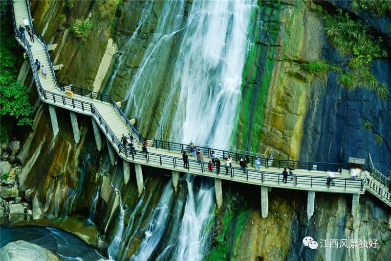 在峽谷兩旁的崖壁上,兩條風(fēng)格各異高空棧道蜿蜒前行、遙遙相望。白鶴崖這邊的棧道,部分采用玻璃鋪設(shè),腳下陡峭峽谷與急流溪水一覽無遺,膽小游客在此可能尖叫不斷、寸步難行。對面的棧道,則別有一番情趣,整個棧道猶如一條玉帶忽隱忽現(xiàn)地穿過大片森林與一群瀑布。這些瀑布有的離棧道較遠(yuǎn),只能舉目眺望;而有的就在棧道腳邊,伸手就可觸及。這些瀑布的水流、形狀也是各不相同,有的水流小又慢,自上而下緩緩地平鋪在整塊大石壁,碰起層層疊疊小水波浪就像一朵朵長在巖山上的花朵,人們稱之巖花瀑;有的則大又急,直接從懸崖峭壁上以“飛流直下三千尺,疑是銀河落九天”氣勢迎頭沖下,大量水花在崎嶇不平的崖壁上四處跳躍、到處濺落,最后全部落入河道中。整個空中彌漫著微白色的水霧,在陽光照射下,形成一座美麗的七彩虹,故名彩虹瀑。從棧道往下看,谷中有三個似圓形大鍋的深水潭,人稱“三口鍋”。傳說女媧補天的五彩石就在這下面,也有人說“三口鍋”底下是暗河,可以直通鄱陽湖。
