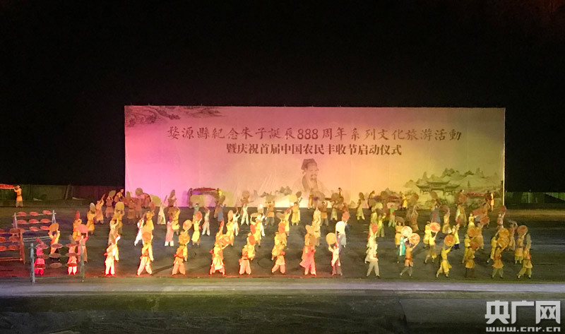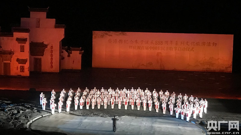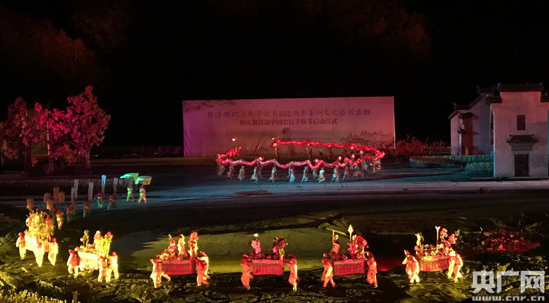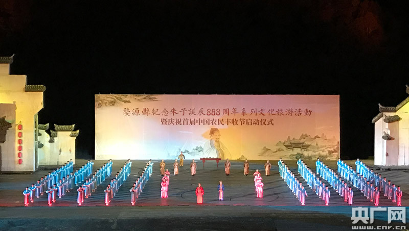 央廣網婺源9月22日消息(王一凡)9月21日晚,婺源縣紀念朱子誕辰888周年系列文化旅游活動暨慶祝首屆中國農民豐收節啟動儀式在夢里老家實景演出現場舉行。
