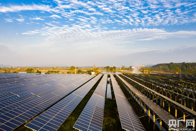 位于江西鄱陽湖畔都昌縣磯山養殖場的漁光發電項目,在陽光的照耀下熠熠生輝,構成一幅秋日美景。近年來,都昌縣利用養殖水面建設80兆瓦“漁光互補”項目,年均發電約8000萬千瓦時,“一池兩用”不僅提高了資源利用率,還增加了單位面積土地的經濟價值。