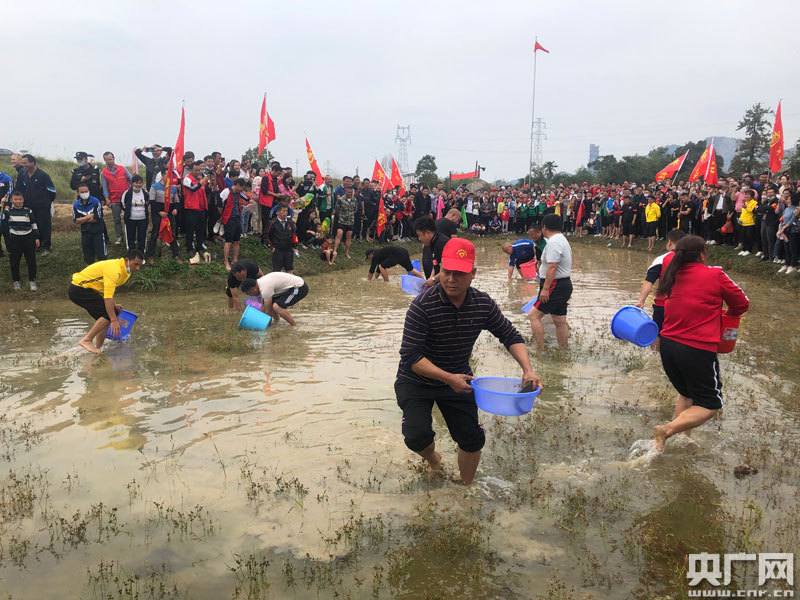 哨聲一響,參賽選手們齊刷刷沖進了稻田里摸魚,稻田瞬間變身一個巨大的田間樂園,觀看的群眾也紛紛給選手們加油打氣,摸魚大戰一觸即發,眾人享受捕抓的樂趣!