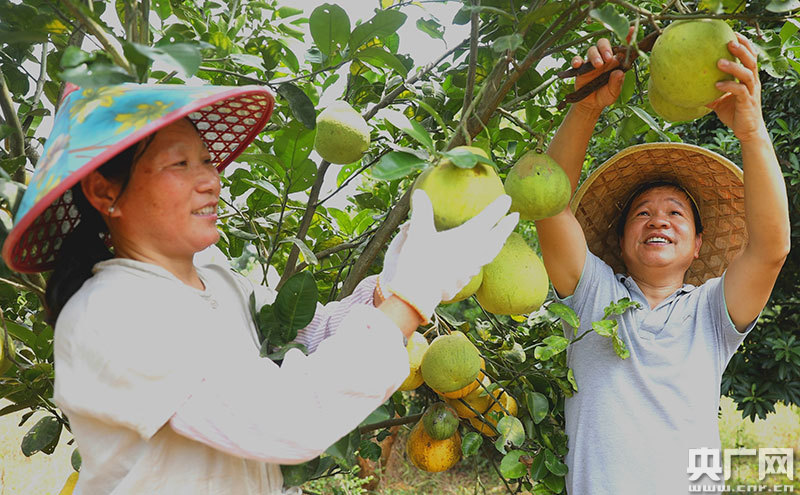 肖浩林夫妻在自家庭院采摘柚子(央廣網發 通訊員供圖)