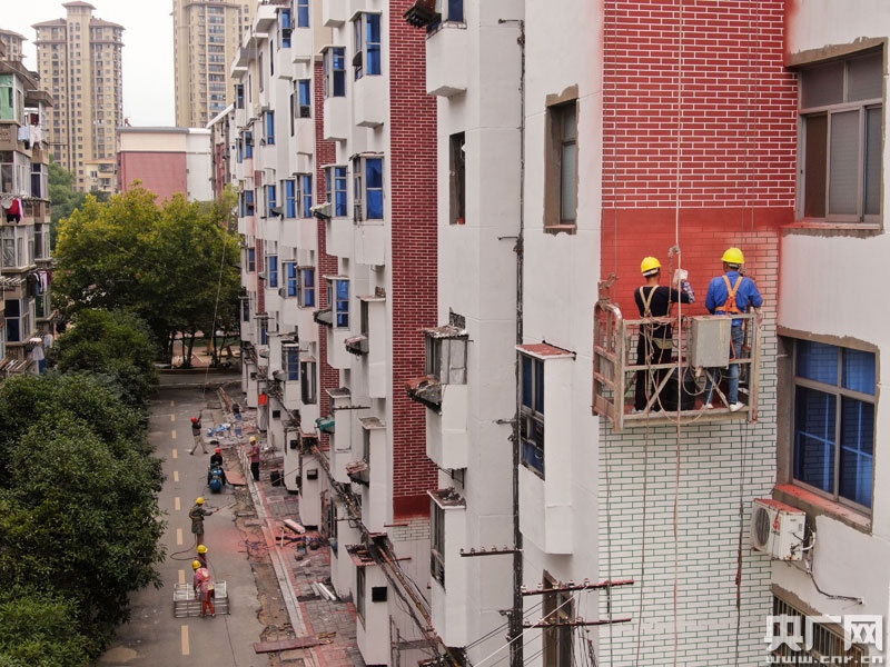在該區古南鎮街道桃樹下社區如意苑小區,工人正在進行外墻改造(央廣網發 通訊員李軍 攝)