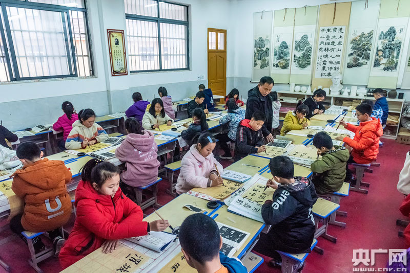 書法社團的學生在老師的指導下練習書法(央廣網發 通訊員供圖)