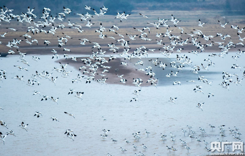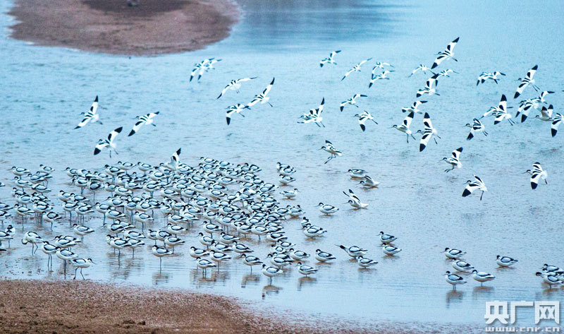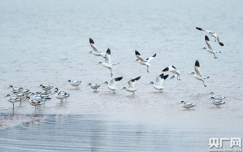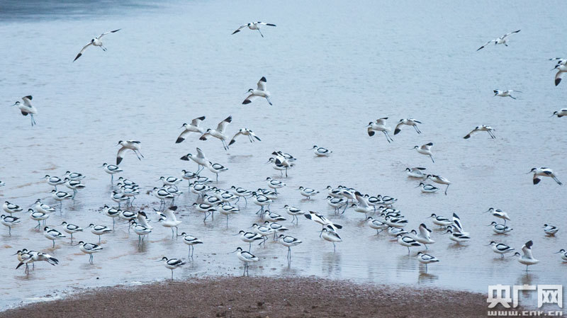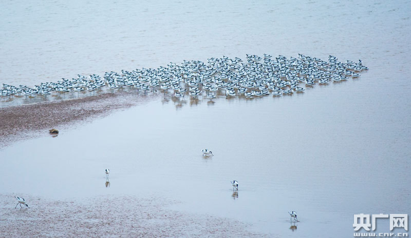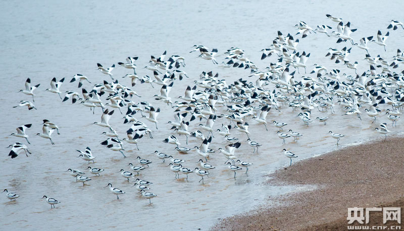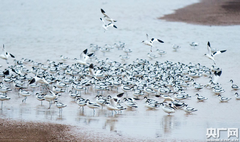 1月6日,大批反嘴鷸在江西鄱陽湖都昌濕地棲息(央廣網發 通訊員傅建斌 攝)