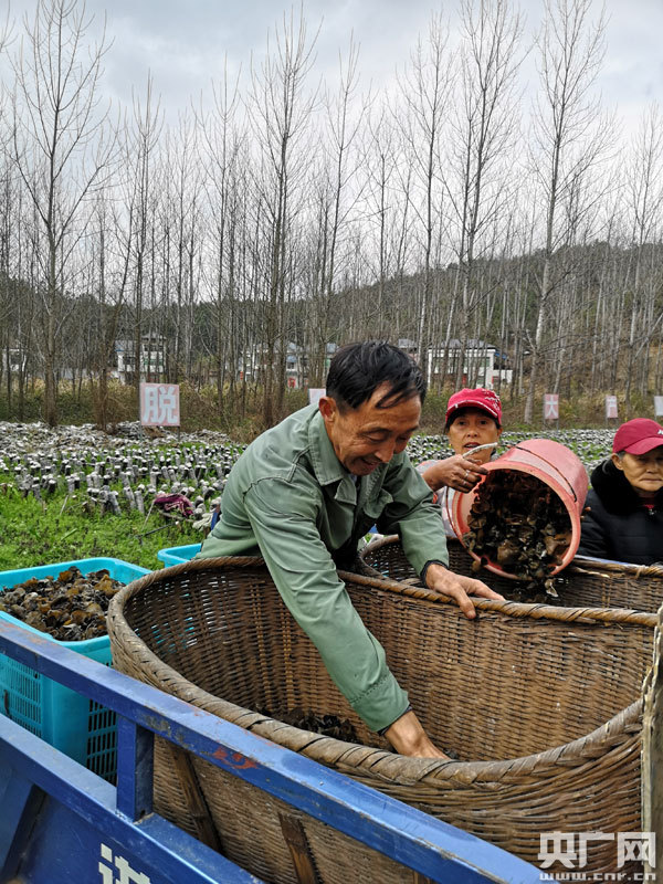 村民將采摘的木耳裝進竹筐