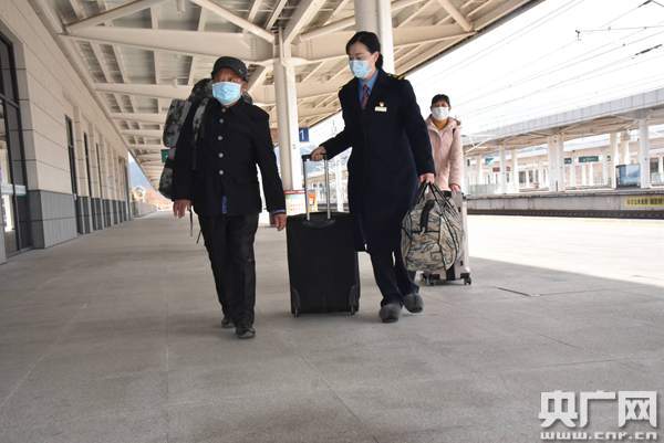 1月28日,在婺源高鐵站,工作人員幫助旅游搬運行李。(央廣網發 單長華攝)