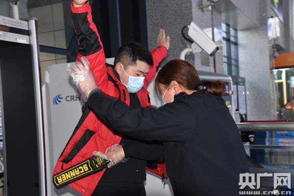 1月28日,在婺源高鐵站,工作人員為旅客安檢。(央廣網發 單長華攝)