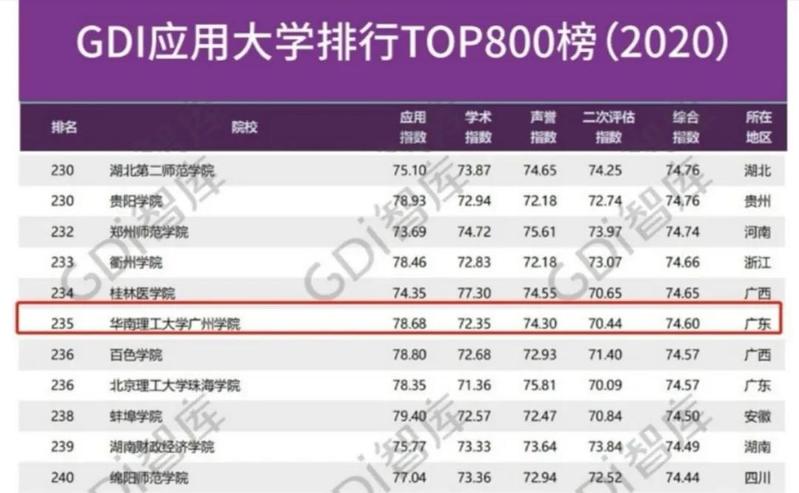 5月17日,廣州日報數據和數字化研究院(GDI智庫)發布了“GDI應用大學排行TOP800榜(2020)”。在榜單中,華南理工大學廣州學院位列全國應用型大學235位,廣東省應用型大學19位。