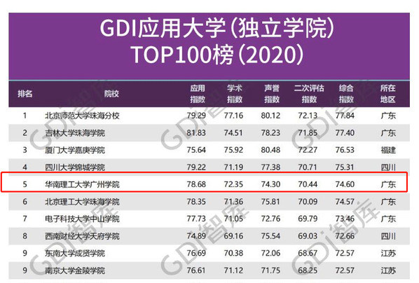 GDI智庫應用大學排行榜獨創性地將公辦普通本科院校、獨立學院和民辦院校共計910所本科高校在同一個體系下進行評價,通過對各高校的應用指數、學術指數、聲譽指數和二次評估指數進行科學評價,得到綜合指數,根據綜合指數確定榜單排名,打造應用大學新型評價體系。值得一提的是,在“GDI應用大學(獨立學院)TOP100榜”中,華南理工大學廣州學院位列全國第五。其中,應用指數和學術指數排名學校位列全國第四,標志著華南理工大學廣州學院在辦學層次和辦學水平上又有了新的飛躍。