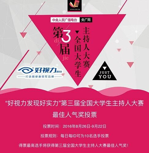 2016年8月26日,中央人民廣播電臺第三屆全國大學(xué)生主持人大賽“好視力發(fā)現(xiàn)好實力”最佳人氣獎選手票選活動全面開啟,進入全國復(fù)賽的71名選手參與了本次票選活動。