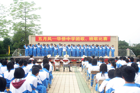 每年一度的班歌團(tuán)歌比賽及入團(tuán)儀式 三、科研興教,以質(zhì)強(qiáng)校 近幾年,學(xué)校本著“既求人人升學(xué),更求個(gè)個(gè)成才”的辦學(xué)理念和“以人為本,凝心聚力,科學(xué)管理,打造品牌”的辦學(xué)方略,狠抓教育教學(xué)質(zhì)量。首先:完善教學(xué)管理體系,實(shí)行層級(jí)管理,形成科學(xué)的管理網(wǎng)絡(luò)。其次,切實(shí)抓好常規(guī)工作,使教學(xué)制度化、規(guī)范化。再次,積極開展新課程教學(xué)改革,加強(qiáng)校本培訓(xùn),更新教學(xué)觀念,探索教學(xué)方法,提高課堂實(shí)效。此外,立足本校實(shí)際,積極開展教育科研,參加課題研究的教師達(dá)到95%以上;多年來,我校共承擔(dān)10項(xiàng)區(qū)級(jí)課題,其中7項(xiàng)已順利結(jié)題;目前,有3項(xiàng)區(qū)級(jí)課題正在研究中。我校形成了“在教學(xué)過程中研究、在研究狀態(tài)中教學(xué)”的濃厚教科研氛圍。科研正努力向以研導(dǎo)教、導(dǎo)學(xué),以研促教、促學(xué),教、研、學(xué)三位一體的目標(biāo)邁進(jìn)。 經(jīng)過多年的努力,我校的教育教學(xué)質(zhì)量成績顯著:2003年——2008年,連續(xù)5年榮獲花都區(qū)教育系統(tǒng)先進(jìn)單位;2003、2004、2006、2007學(xué)年度均榮獲花都區(qū)教育教學(xué)質(zhì)量一等獎(jiǎng);近幾年,我校參加廣州市高中階段招生考試,成績連續(xù)多年保持穩(wěn)定的上升趨勢(shì),2007年——2009年,在全區(qū)30間中學(xué)分別排名第四、第五、第三。2007年11月,我校學(xué)生參加區(qū)第七屆運(yùn)動(dòng)會(huì),總分榮獲全區(qū)第三名;2007年12月花都區(qū)體育大課間評(píng)比獲第一名;2008年12月獲區(qū)第三屆學(xué)校藝術(shù)節(jié)三等獎(jiǎng)……優(yōu)異的成績得到了上級(jí)領(lǐng)導(dǎo)的一致好評(píng)和社會(huì)肯定。