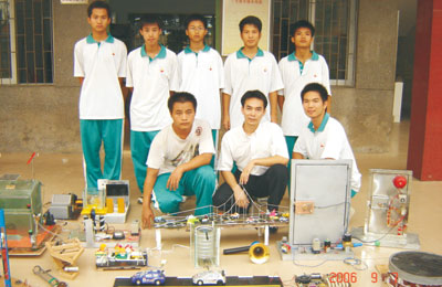小發(fā)明家們與作品 花都區(qū)第一中學在推進素質(zhì)教育取得全面進步的基礎(chǔ)上,根據(jù)自身特點和地方資源優(yōu)勢,著眼于學校和學生的共同發(fā)展,確定特色學校創(chuàng)建目標,并按特色項目學校特色特色學校三個階段制訂創(chuàng)建規(guī)劃。緊緊圍繞“科技創(chuàng)新教育”,大力開展“科技活動節(jié)”、“研究性學習與社會實踐活動”、“科技小發(fā)明與小創(chuàng)作”三大主題活動,已逐步形成了以學生科技興趣小組活動和研究性學習為載體,以培養(yǎng)學生創(chuàng)新精神和實踐能力為目的的科技創(chuàng)新教育的辦學特色,走出了一條教學與科技創(chuàng)新相結(jié)合的辦學新路子。學校成立創(chuàng)建特色領(lǐng)導(dǎo)小組,加強管理,精心營造校園科技環(huán)境教育氛圍,先后建設(shè)一批科技教育景點和科技活動專用場室,如科技展覽室、科技實踐活動室、勞技制作室等,新建的科技教育景點有:150米科技宣傳長廊、氣象自動報測系統(tǒng)、太陽能熱水系統(tǒng)、風能發(fā)電校名顯示系統(tǒng)、聲控噴水系統(tǒng)、紅外線感應(yīng)智能沖水系統(tǒng)、紅外線感應(yīng)防盜系統(tǒng)、梯燈聲控開關(guān)系統(tǒng)等,同時在學校管理中使用具有一定科技含量的設(shè)施,如學生管理IC卡(考勤、圖書館、食堂一卡通用)、閉路電視監(jiān)控系統(tǒng)等,使校園的科技教育文化更鮮明、更濃郁、更生動。同時通過這些景點激發(fā)了學生的科技興趣,啟迪學生的科技意識。學校科技教育成績顯著,從2001學年至2008學年學校連續(xù)八年被評為“廣州市青少年科技教育先進集體”,先后被評為“廣州市綠色學校”、“廣州市青少年科技教育特色項目學校”、“花都區(qū)特色實驗學校”、“花都區(qū)知識產(chǎn)權(quán)教育試點學校”。近三年來,學生研究的小發(fā)明,小創(chuàng)作達250件,學校組織學生參加各類科技競賽獲獎達239項,其中省級8項,市級85項,區(qū)級146項。 碩果累累 成績卓著 隨著教育改革的進程不斷深化,學校步入了全面發(fā)展的快車道,其發(fā)展之快,進步之大,前所未有。十年間,學校通過多種渠道和途徑籌集資金1200多萬元用于校園改造和設(shè)施建設(shè),使一所規(guī)模較小,設(shè)施簡陋,以破舊平房為主的鄉(xiāng)村學校發(fā)展成具有現(xiàn)代化氣息和園林式特點的新型學校。學校布局合理,規(guī)劃科學,寓美化、綠化、園林化和校園文化于一體。教學設(shè)備儀器完備齊全,校園網(wǎng)絡(luò)已投入教學使用,教學平臺已普及到班,各種專業(yè)場室一應(yīng)俱全,辦學條件已初步實現(xiàn)現(xiàn)代化。學校被評為花都區(qū)“文明校園”,廣州市教育技術(shù)裝備管理工作先進集體。